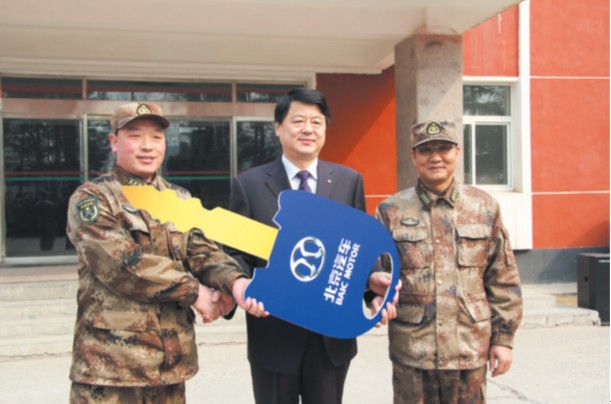 北京股份公司3月26日向驻守在顺义的北京卫戍区66168 部队赠送6辆“勇士”军车仪式在66168部队举行。北汽股份总裁韩永贵、北京分公司领导参加了交车仪式。